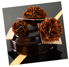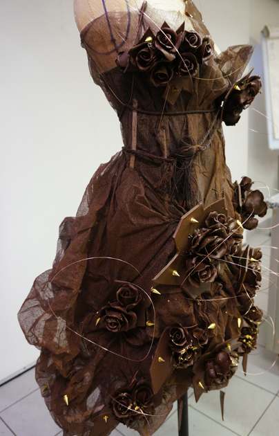 Un vrai travail artisanal de roses réalisées à la main en chocolat noir… Une robe bustier au genou dont l’amplitude est garnie de roses gourmandes !